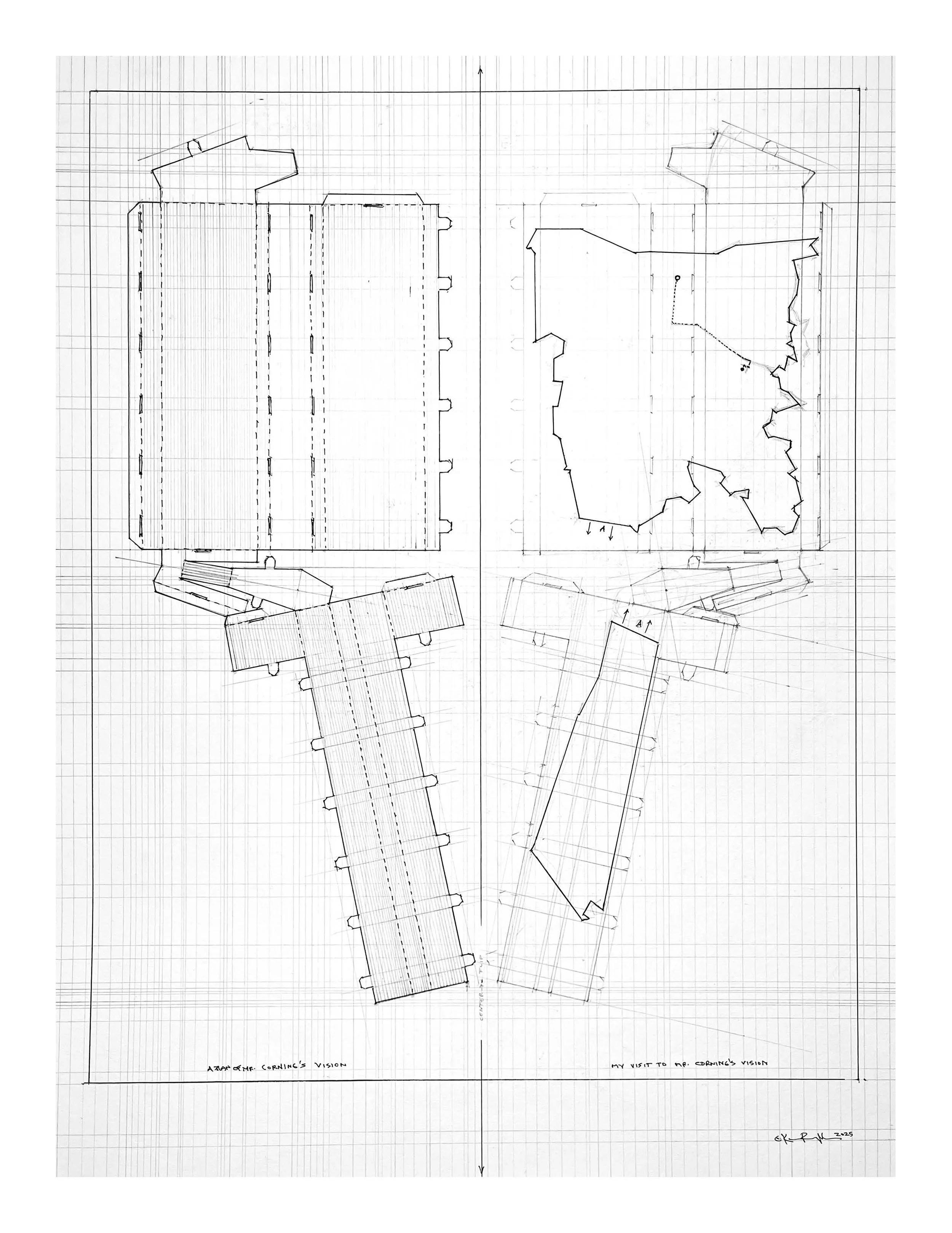 'Me and Mr. Corning' is a comparative description of two opposing philosophical visions for the experience of living in the city of Albany. One side illustrating grounded and digestible bits of repeatable physical experiences, and the other a remote and scaleless architectural monument to egoism and manifest destiny.
