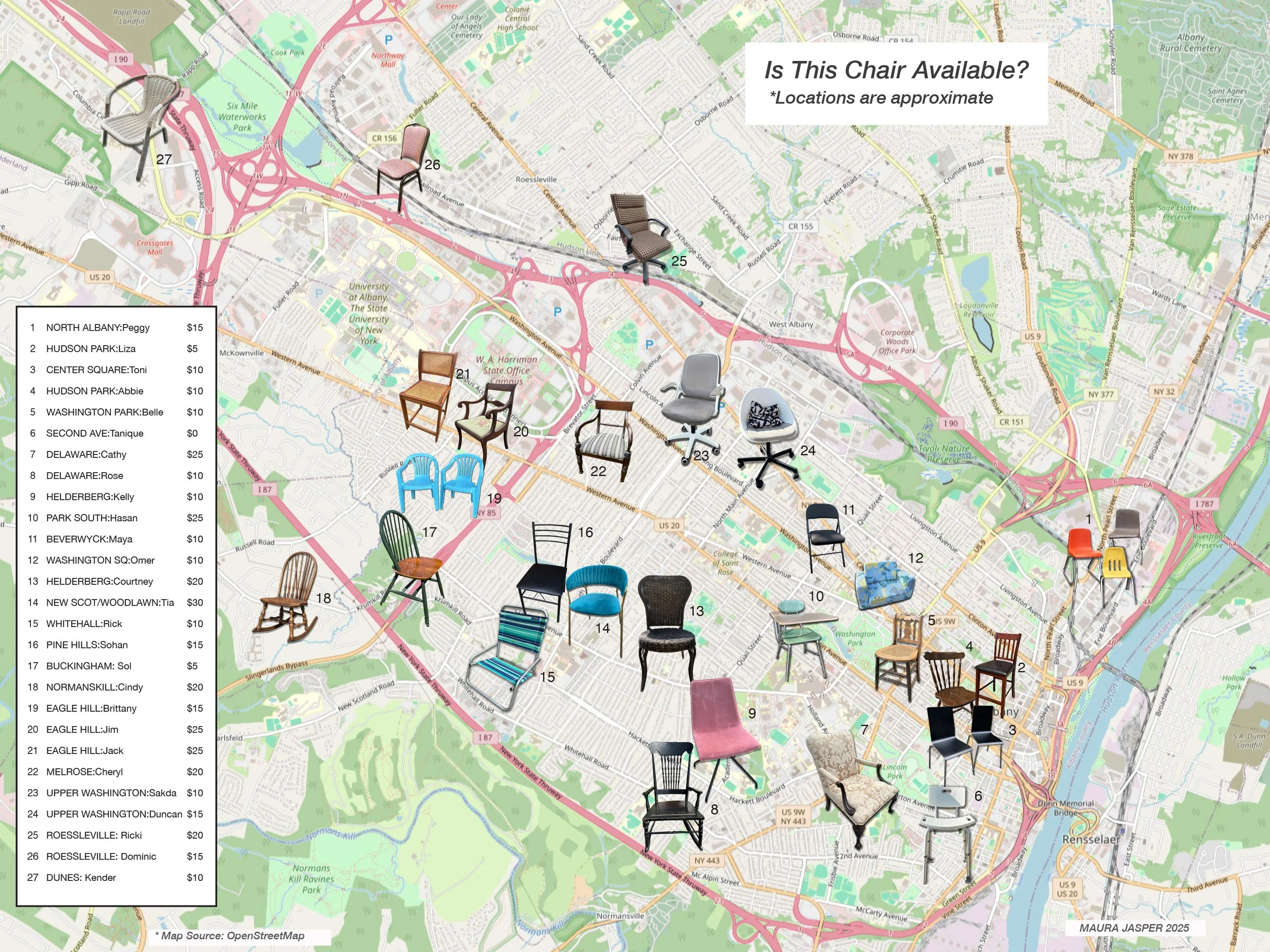 (Untitled as of yet) maps Albany through secondhand chairs collected from across the city via Facebook Marketplace. Arranged according to their points of origin, the installation reflects the social, economic, and emotional terrain of place, one marked by use, memory, and quiet transactions between strangers. It is a portrait of Albany built from things left behind, exchanged, and absorbed into the lives of others.