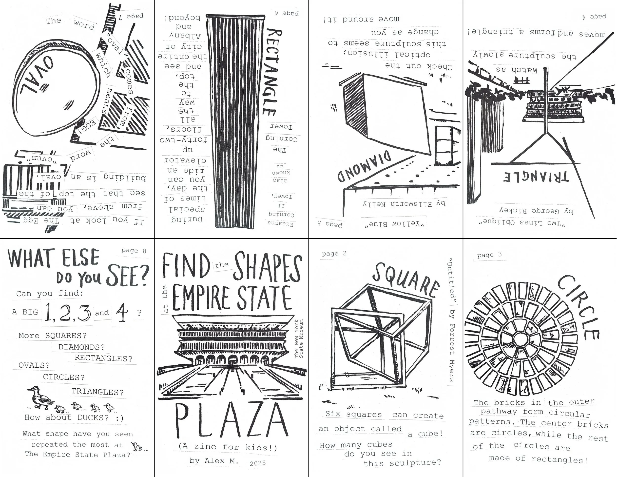 This map is intended to be enjoyed with a child on a walk through the Empire State Plaza. The space is so massive and serious, but all the basic building-block shapes that we learn as children are there if we look for them. Use the takeaway zine as a guide for a stroll through the iconic architecture, and see what you can discover!