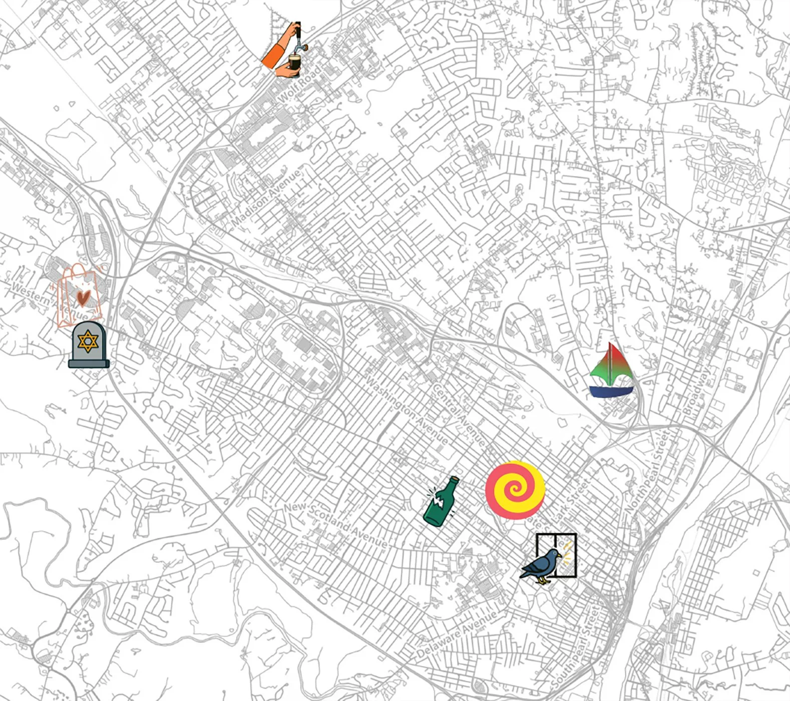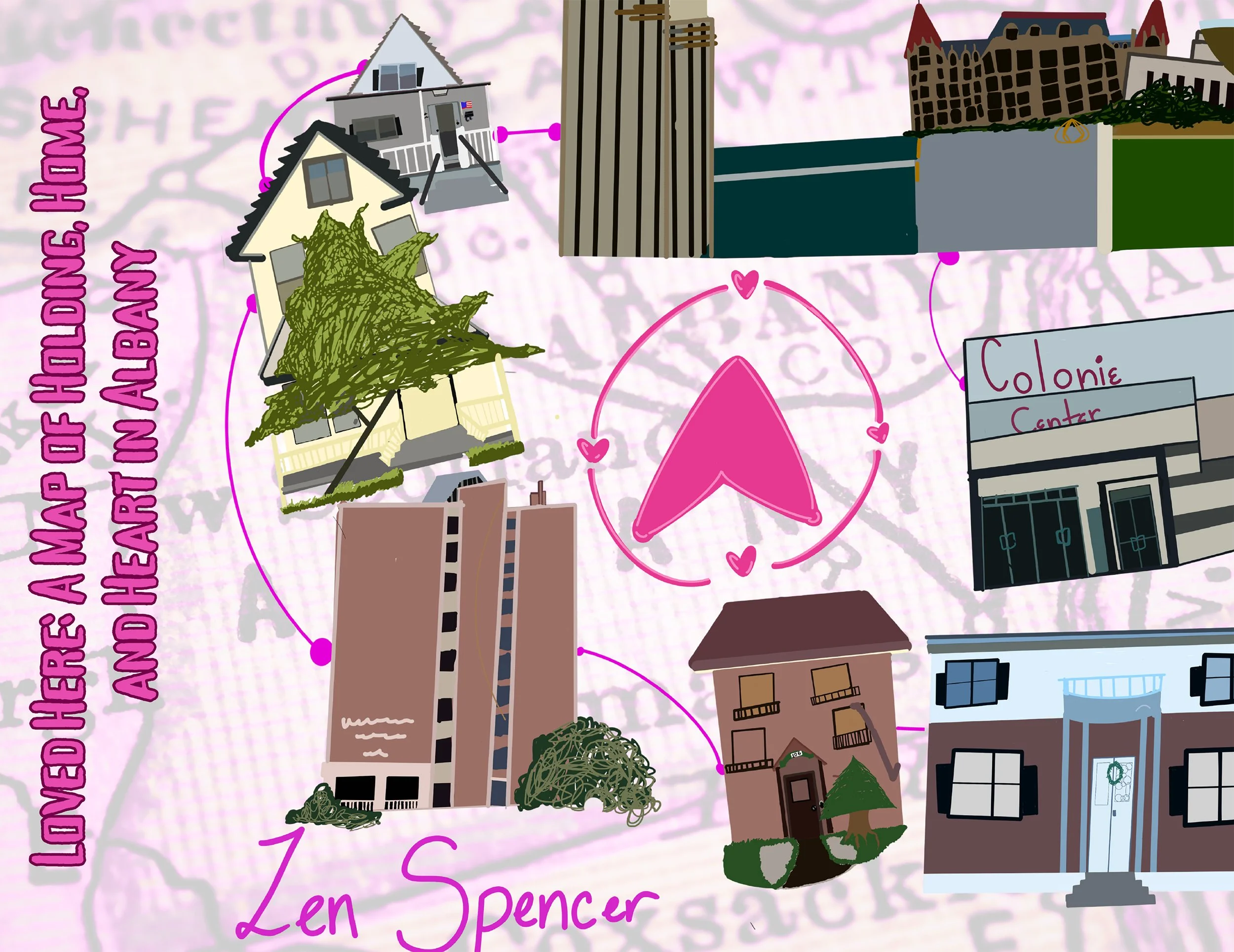 My map is a visual representation of how I felt navigating early adulthood in a town I never thought of as home. Albany is my birthplace and first “home”; half of my family originated there. After moving away for about 16 years and coming back for college, my experience living there was flooded with new situations, growing into adulthood, self-preservation, and self-exploration I am presenting my internal battle with feeling lost and confused while trying to figure out the next step in life as a growing young adult in Albany.