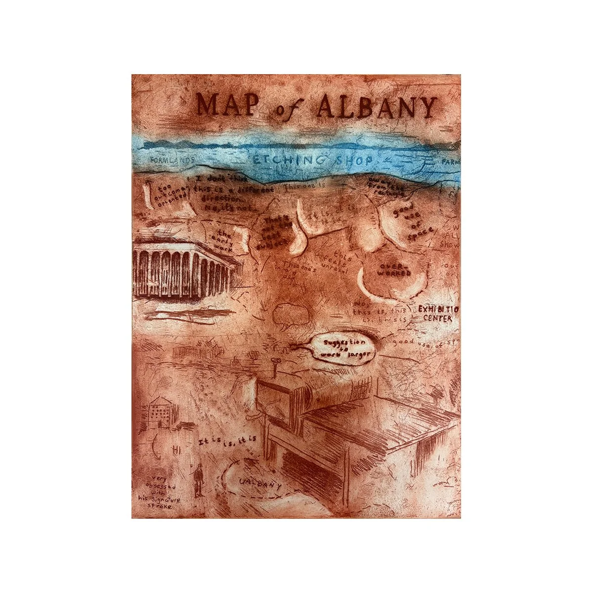On This etched map reimagines Albany through the emotional and gravitational pull of a familiar art department. Inspired by Saul Steinberg’s satirical cityscapes and the allegorical engravings of Goltzius and Dürer, the piece distorts geography to reflect the psychic weight of critique rooms, studio classrooms, and gallery spaces. Locations are scaled and placed according to their emotional relevance rather than physical coordinates. The map combines traditional intaglio printmaking with hand-colored watercolor and pencil, layering architecture with overheard phrases, remembered commentary, and personal landmarks. It’s both a love letter and an inside joke -- charting the terrain of art-making, memory, and institutional life.