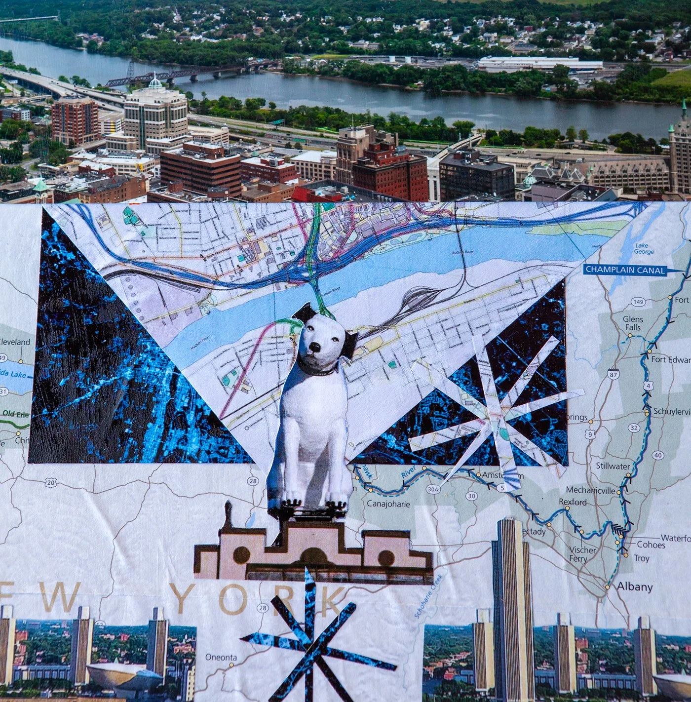 This map explores the intersection of geography, memory, and connection along the Hudson River in Albany. It blends abstract expression with cartography while incorporating photos, scraps of map, and recycled materials to create a layered interpretation of the river's presence in Albany.