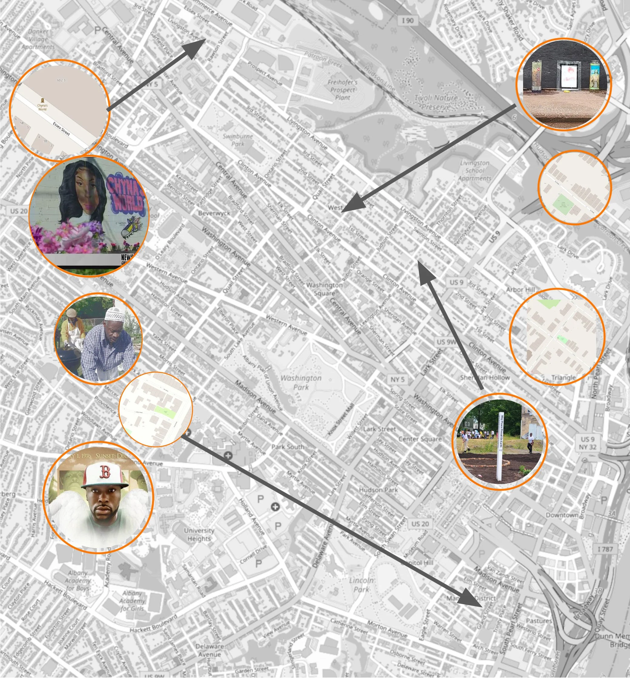 Albany, the capital city of New York, contains a concentration of memorials to the conquest and conflicts that established and uphold the settler-colonial state. These wars have names, which are recorded on the plaques and granite bases of monuments that surround the State Capitol/Empire Plaza complex - World War II, the Korean War, the Vietnam War, etc. Beyond this complex, however, there are dozens of memorials - small and smaller - to an endless war that has no name. Since the year 2000, over 462,000 Americans have died by gun violence. This map and guide records some of the common memorials that people have painted, installed, or erected to remember loved ones who died in this war, as combatants or bystanders.
